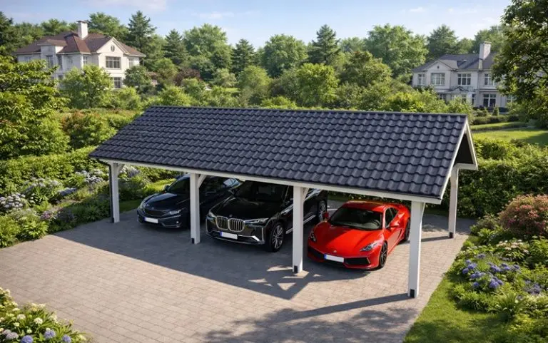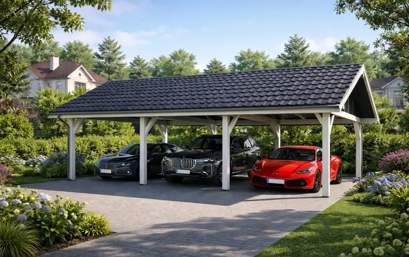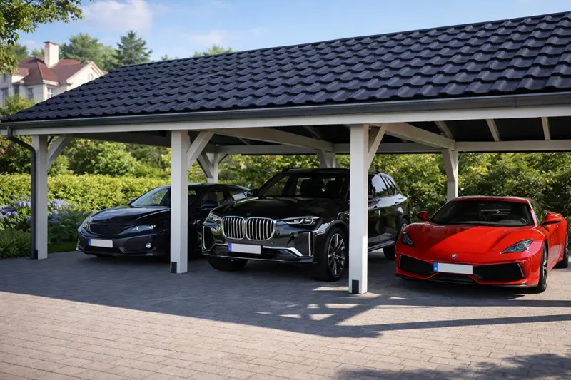 Wiata na 3 auta idealnie sprawdzi się jako wiata do restauracji, hotelu czy firmy, ale coraz częściej kupują ją również osoby prywatne posiadające trzy samochody. Dostępna również w wersji 600×520 cm, idealna na 2 auta.