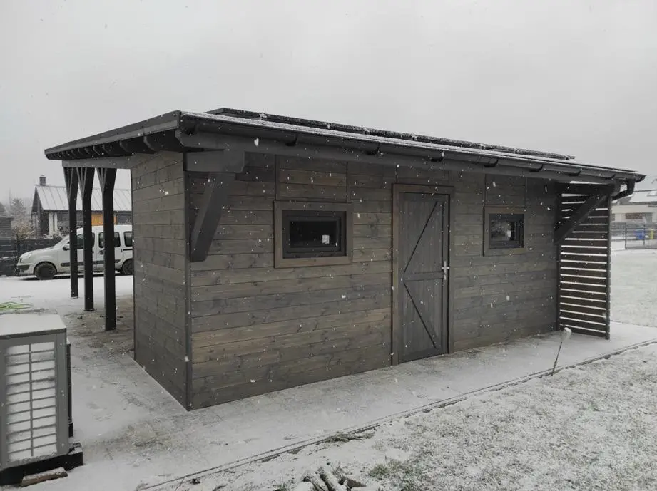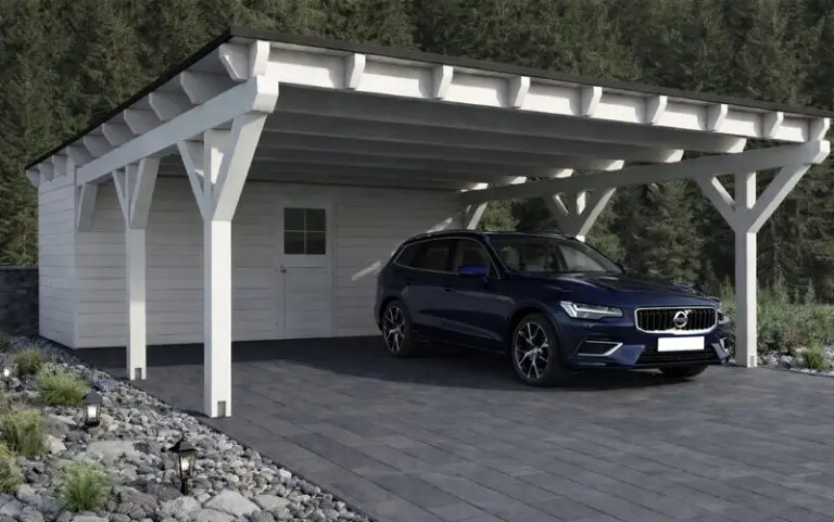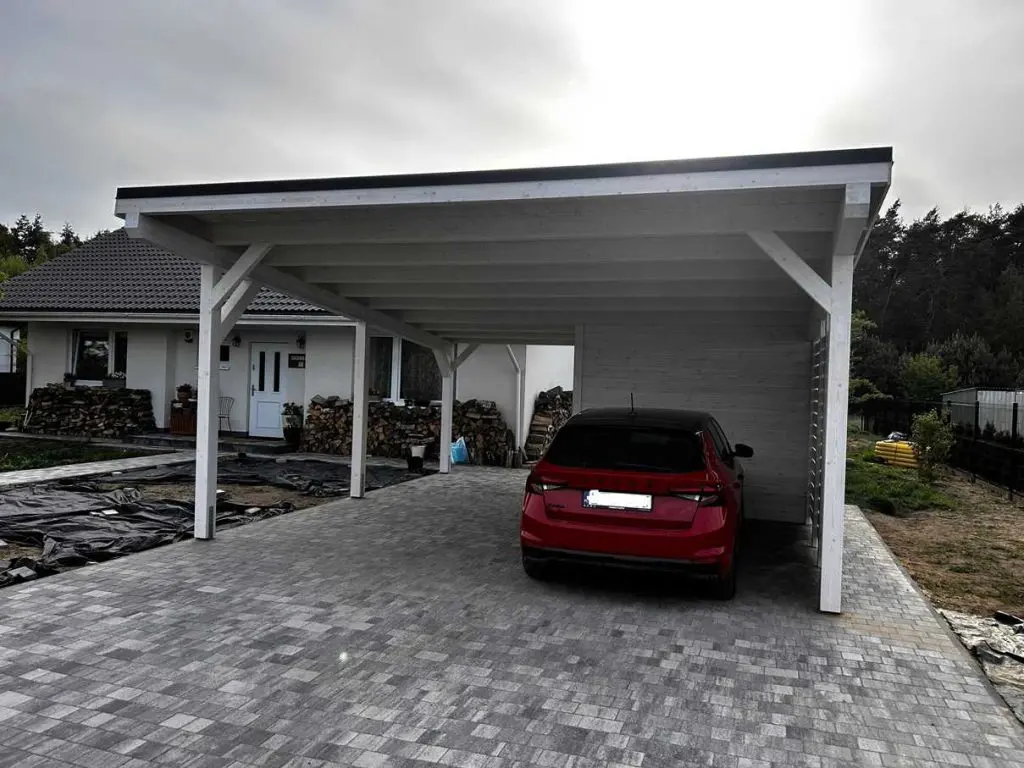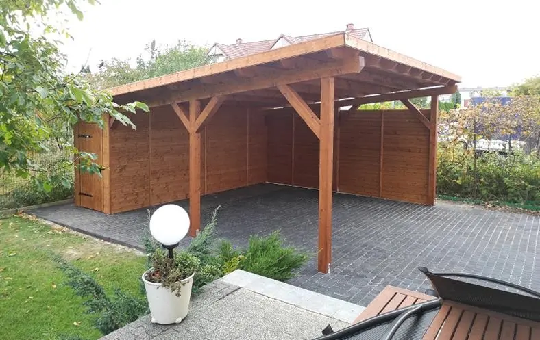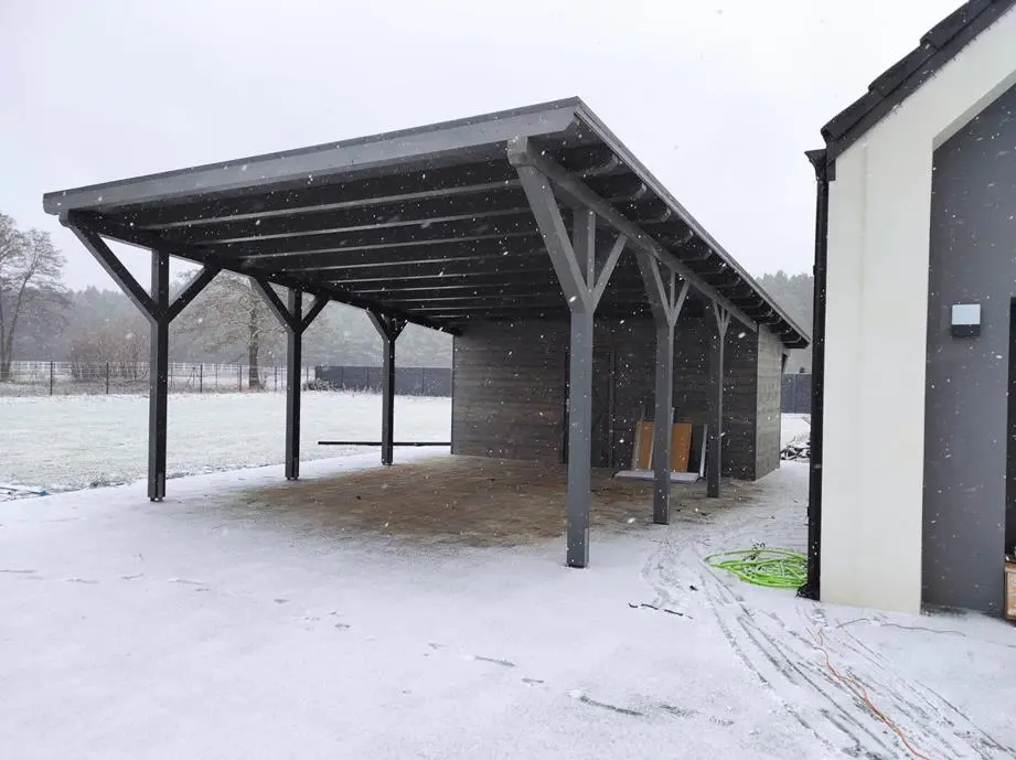 Dakota Superior – nowoczesna wiata drewniana na 2 auta z dodatkowym pomieszczeniem gospodarczym, stylowa konstrukcja wiaty z drewna świerkowego BSH o przekrojach słupów 14cmx14cm, standardowe wielkości carportu to 580×700 cm lub 580×800 cm z możliwością zamówienia na dowolny wymiar.