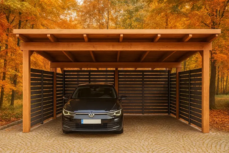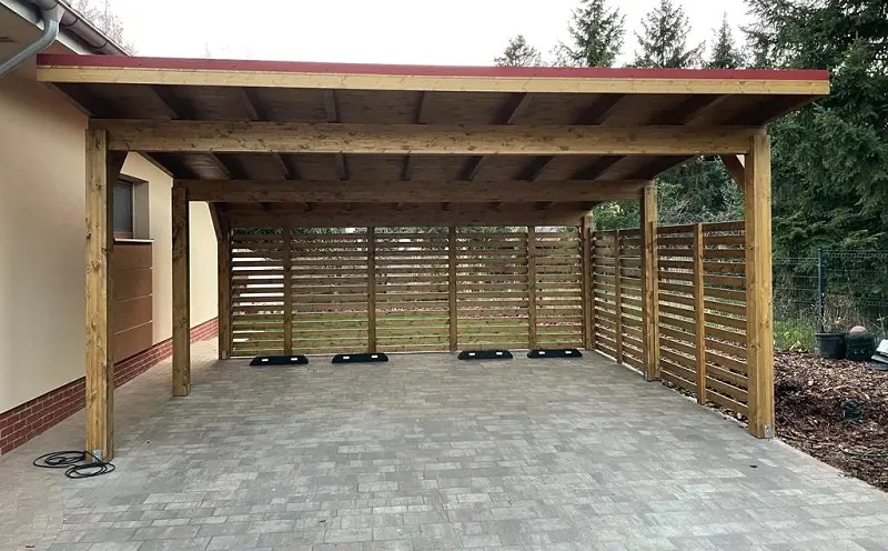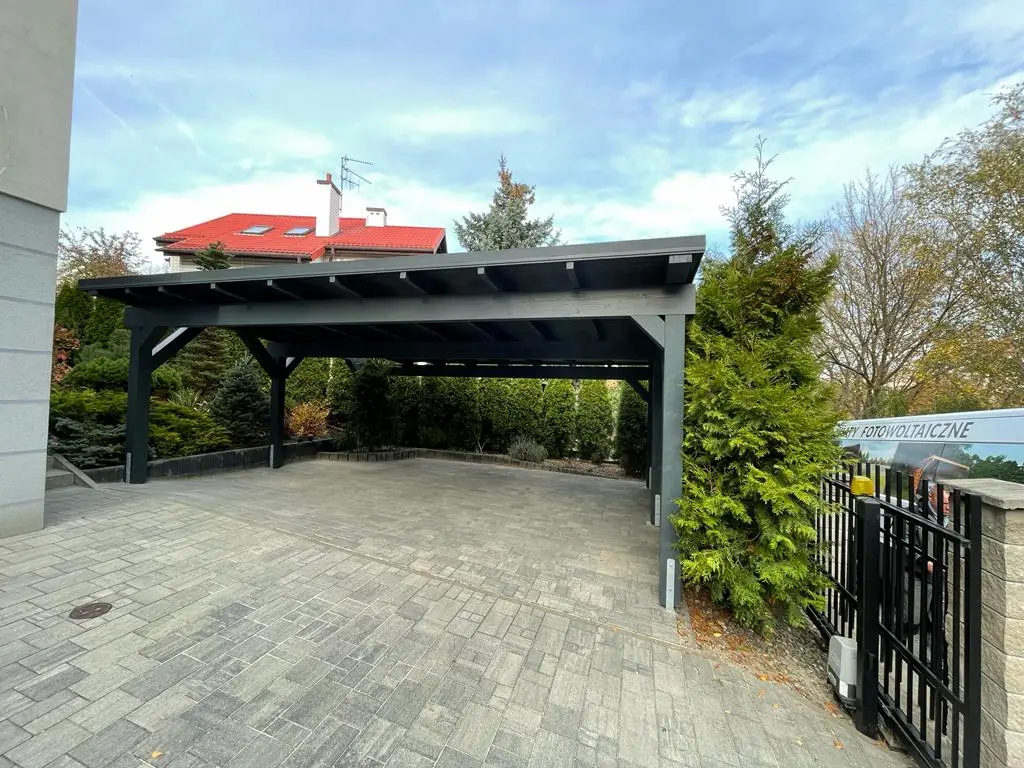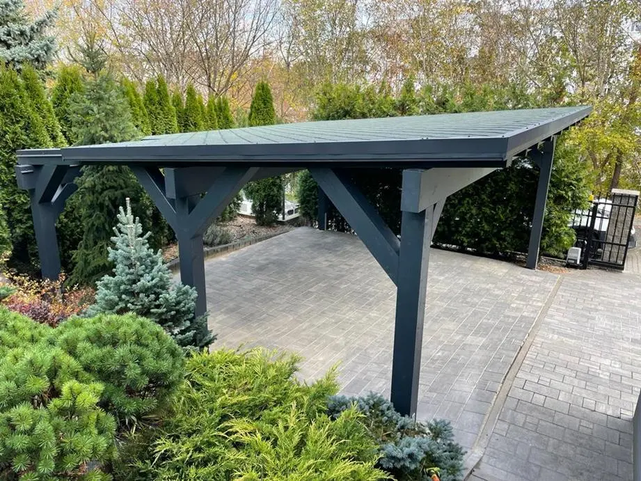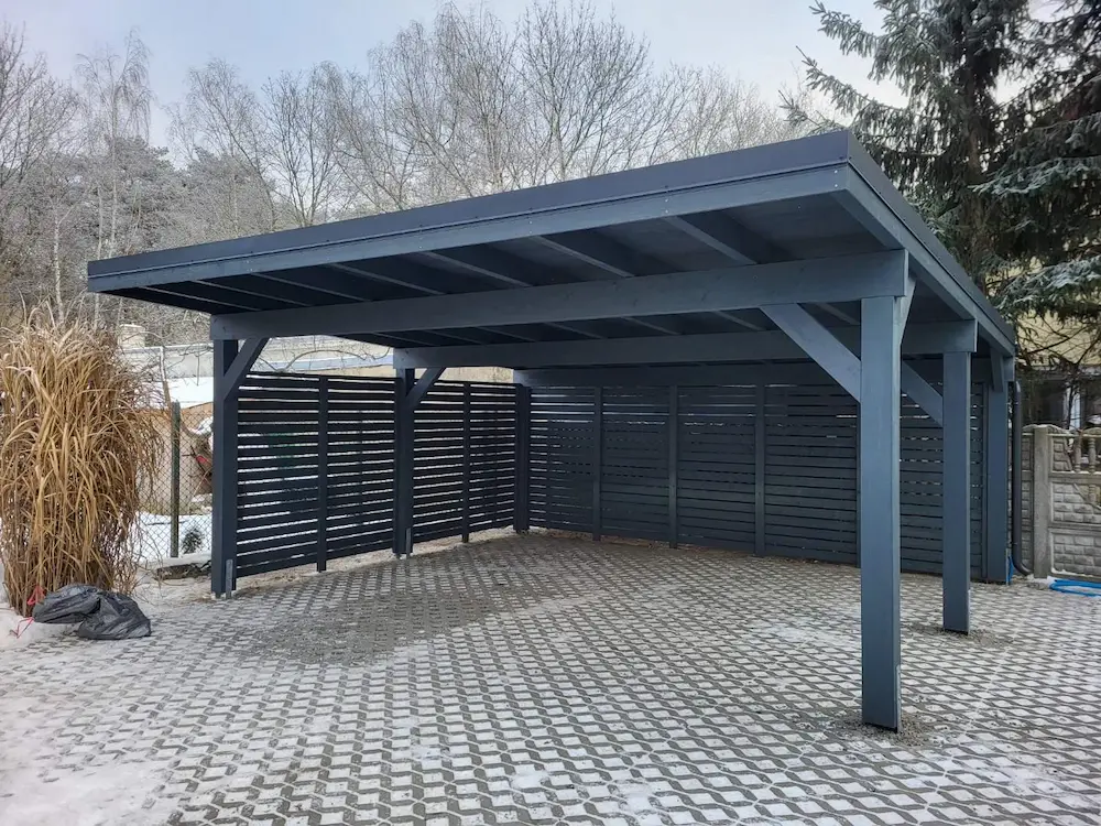 Wiata garażowa 6×5, stylowa i solidna konstrukcja wiaty z drewna, o przekrojach słupów 16cmx16cm, standardowa wielkość carportu to 580×500 cm z możliwością zamówienia na dowolny wymiar.