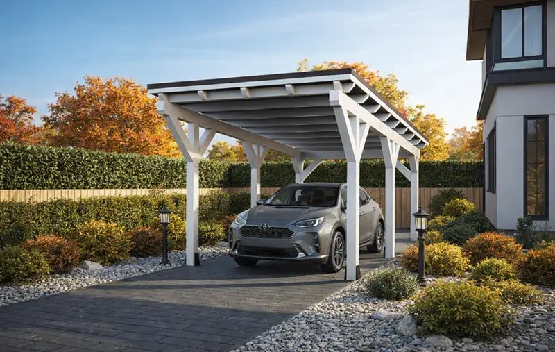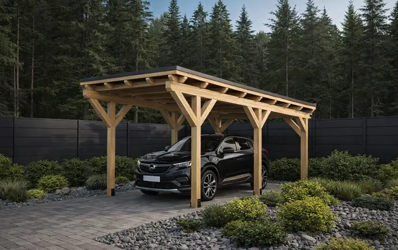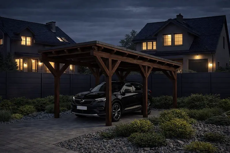 Dakota Single – wiata 3×6 m na jeden pojazd to nowoczesna wiata garażowa o wymiarach podstawy 262×490 cm – całkowity wymiar 320×590 cm. Kompaktowa konstrukcja w zupełności wystarczy, aby zabezpieczyć dowolny samochód osobowy czy SUV-a przed warunkami atmosferycznymi. Niniejszy model przypadnie do gustu osobom, które poza samą osłoną samochodu chcą postawić na najnowocześniejsze wzornictwo i bezstresowo wkomponować carport w istniejącą architekturę.