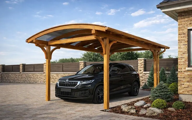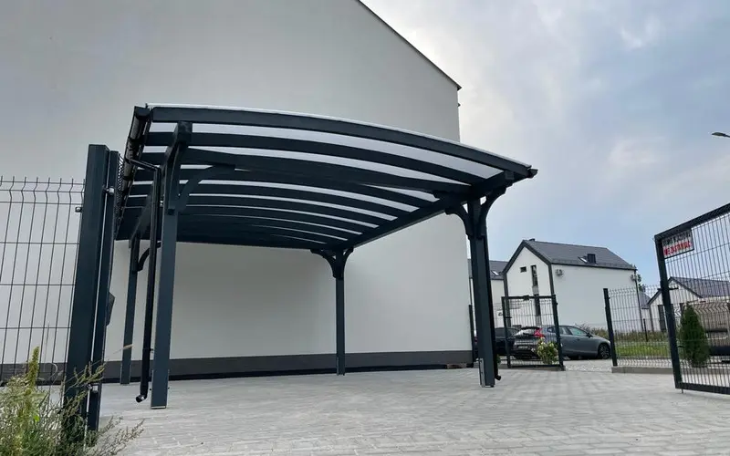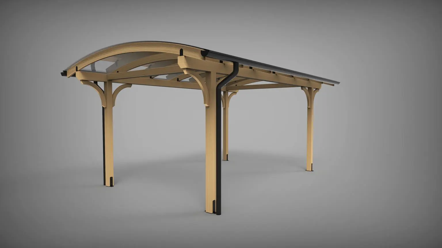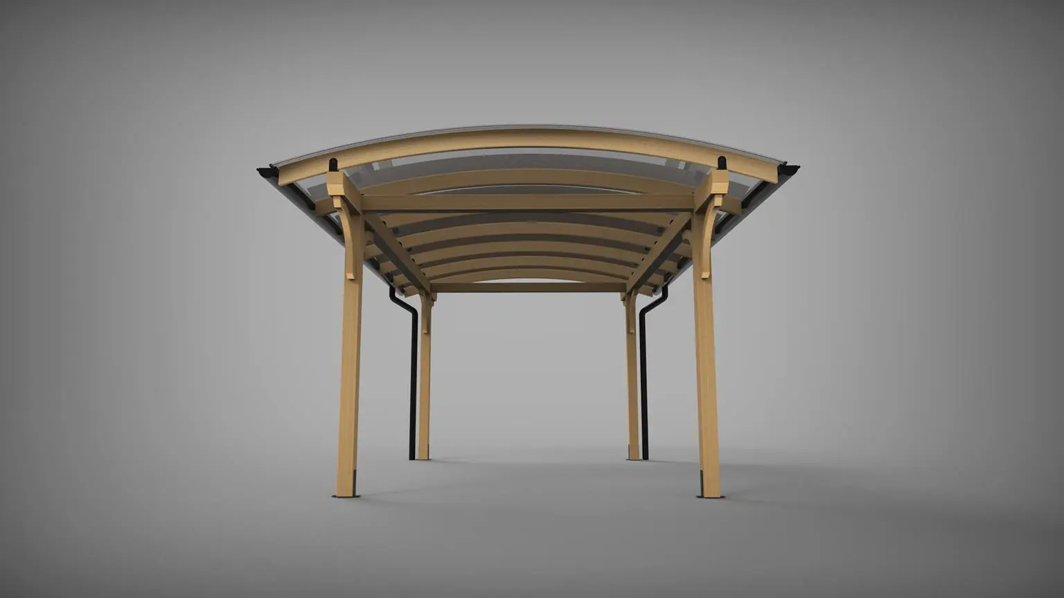 Carport z dachem z poliwęglanu z przeznaczeniem na jeden pojazd. Dzięki zastosowaniu łuków z drewna gięto klejonego kształt wiaty nabrał subtelności. Transparentne zadaszenie z poliwęglanu kanalikowego doskonale sprawdza się w przypadku, gdy carport chcemy zaadaptować na przykład jako wiatę rowerową.  Wiata poliwęglanowa może również występować jako element szeregu, na przykład na dużych parkingach osiedlowych. Dzięki odpowiedniemu zaprojektowaniu konstrukcji, obiekt może być łączony modułowo.