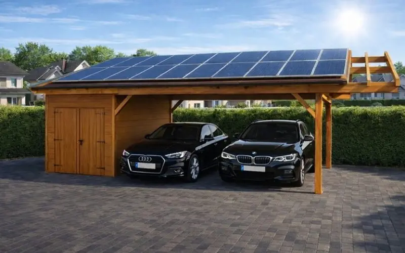 Carport fotowoltaiczny Melbourne to bardzo chętnie wybierany projekt przez naszych klientów. Carport może pełnić funkcję carportu fotowoltaicznego, altany ogrodowej, a także posiada pojemny schowek na narzędzia i akcesoria ogrodowe. Wszechstronność oraz nowoczesny wygląd sprawiają, że jest to jeden z najchętniej kupowanych carportów znajdujących się w naszej ofercie. Obiekt do przystosowania pod Państwa projekt PV.