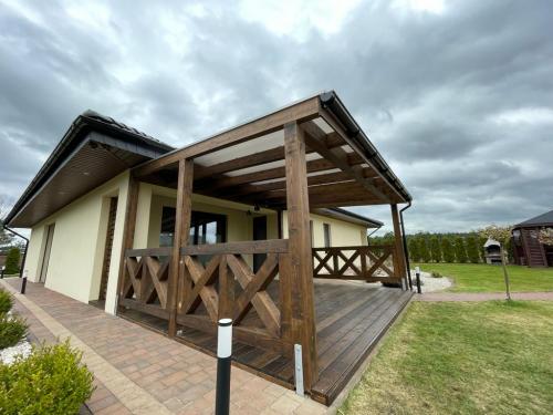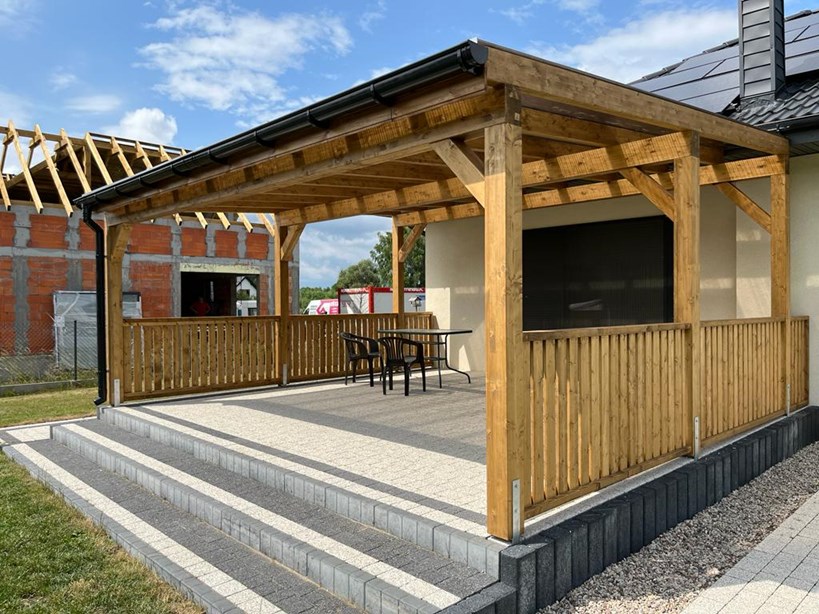 Wyróżnia się prostymi, eleganckimi liniami, które podkreślają nowoczesny charakter konstrukcji. Drewno użyte do budowy zadaszenia jest starannie wyselekcjonowane, o naturalnym pięknie i wytrzymałości, co gwarantuje długotrwałą jakość i estetykę.
